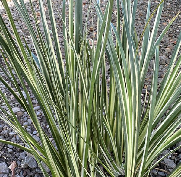 Acorus gramineus 'Argentiostratus' Beautifully variegated, compact, rush-like plant for damp or water margin. 30cm. high. Price: £7.50