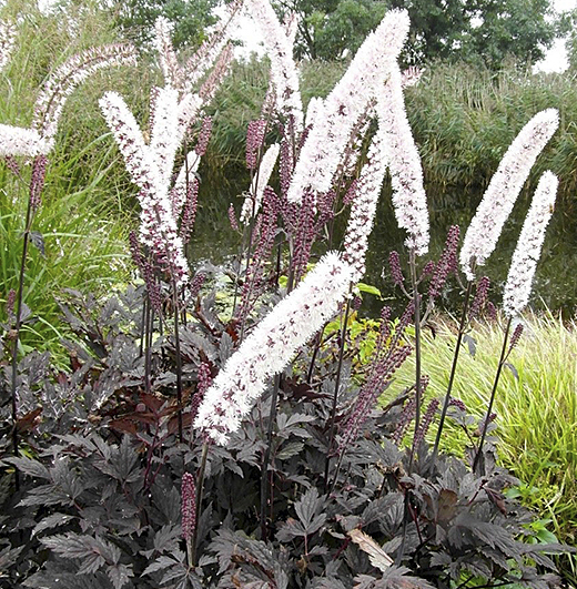Actaea simplex 'James Compton' Very choice cultivar with very dark coppery maroon foliage. Near black stems carry pure white, scented, bottle-brush flowers in September-October. Superb for rich fertile soil. 150cm. high. Large pots.