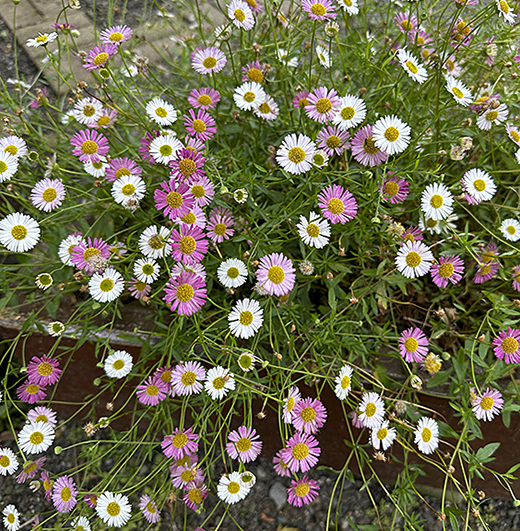 Masses of small pink & white daisies May to October. Gradually naturalising in horizontal wall crevises & at the back of steps. Very good in pots. 10-15cm. high. (Syn. E. mucronatus 'Profusion' )