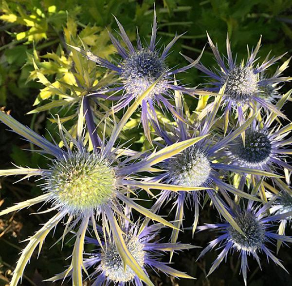 Eryngium x zabellii 'Neptune's Gold' Unusual, lovely new addition, with golden foliage holding blue stems of spiky blue and gold flowers for many summer months. 50cm. high, prefers sun, ordinary soil. 1 litre pot.