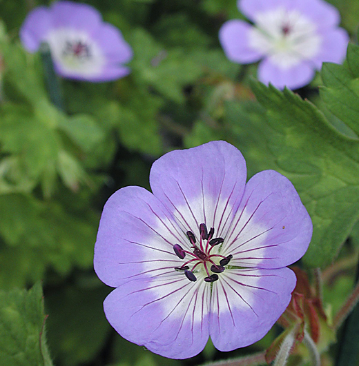 Geranium wallichianum 'Buxton's Variety' Attractively marked foliage. Spode-blue flowers with distinctive white centres. In flower from June until well into the autumn. 30cm. high.