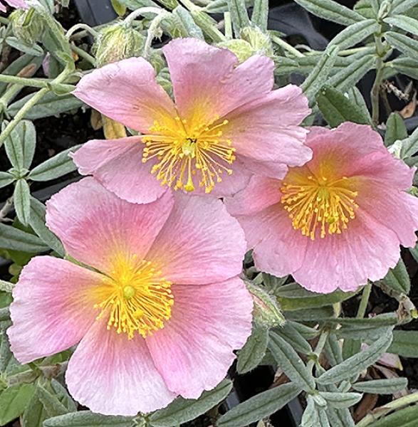 Helianthemum 'Wisley Pink' Exceptionally floriferous cultivar with pale silvery-grey foliage and single rose-pink flowers in profusion. Excellent for any sunny, free-draining site, rockeries, raised beds, along paths etc. 25cm. high.
