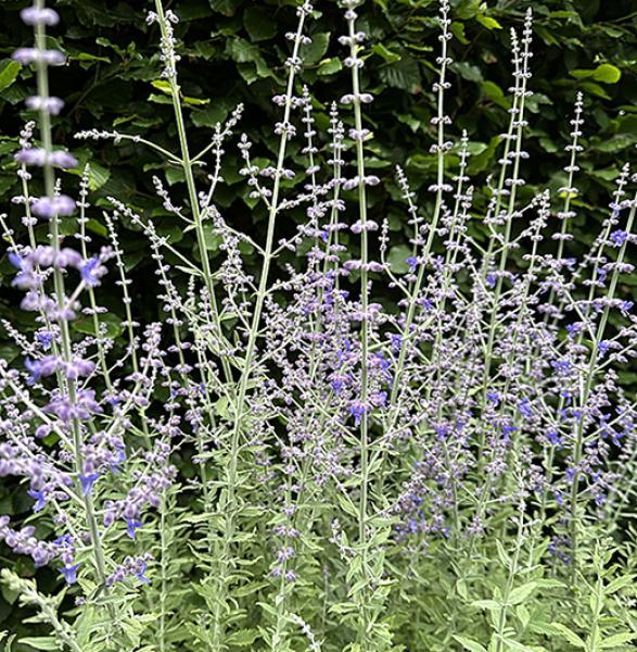 Perovskia atriplicifolia 'Prime Time' Clumps of silvery foliage carry numerous spikes of purple-blue flowers from July to October. Seems very hardy, needs full sun and good drainage. 50cm. high. Price: £7.50