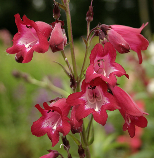 Penstemon 'Ellenbank Cardinal' (EM) Large flowers of good quality and substance in a dark ruby-red, pale within. A very striking hybrid of P. 'Garnet' and P. 'Castle Forbes' which ocurred in our Penstemon stockbed. 90cm. high.