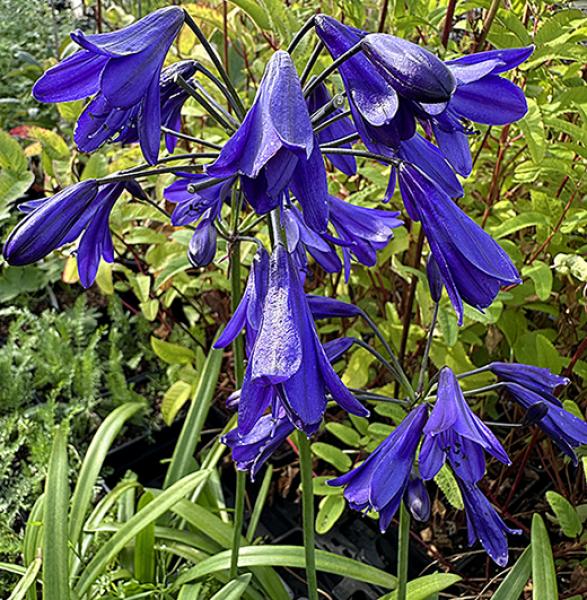 Agapanthus 'Midnight Sky' Semi-evergreen clumps of foliage produce long-flowering intensely dark-blue flowers in July and August. For full sun, Fully hardy, but a mulch is recommended in very cold gardens. 40cm.high. Price: £8.50 Notes: Harmful if eaten