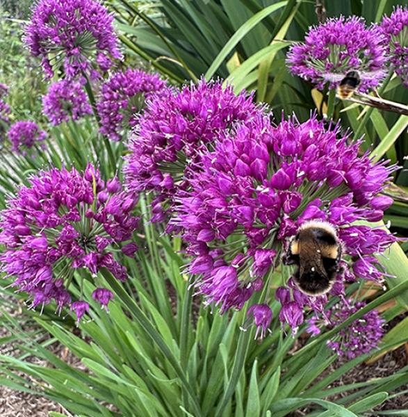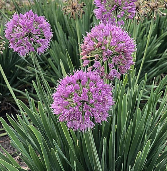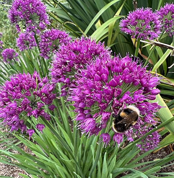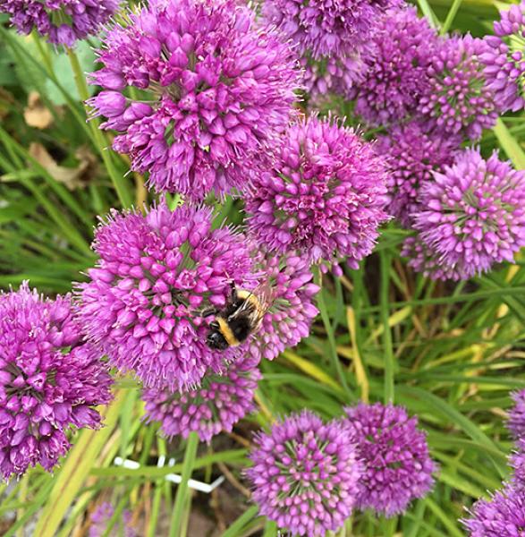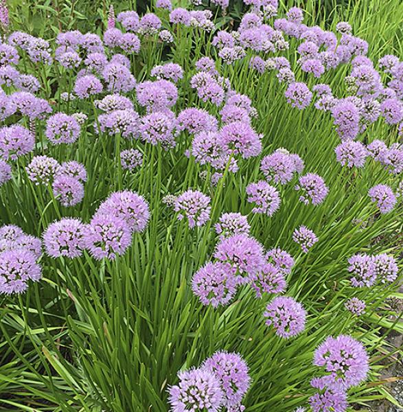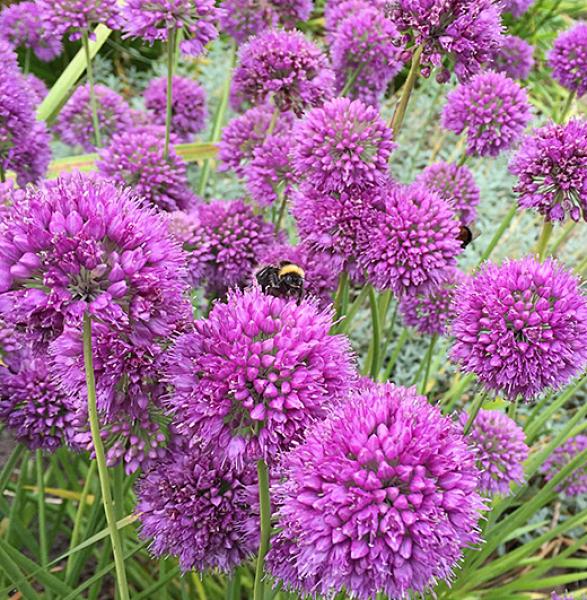 Allium 'Lavender Bubbles' Winner of Best Perennial 2021. Neat clumps of foliage produce a mass of dark lavender-purple flower heads through July and August. Fantastic bee-plant. 50cm. high.