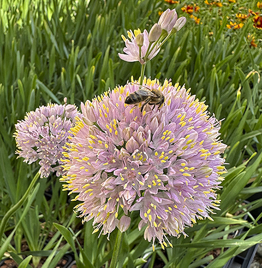 Allium 'Bubble Bath' New variety producing large clumps of glaucous grey-blue foliage with strong stems of large pale lavender-pink flowers, early summer to autumn. Easy in sunny sites. With larger flowers and taller than others in this group, 50-60cm. high. Price: £7.20