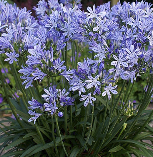 Agapanthus 'Charlotte' Evergreen, making neat clumps. Sturdy stems produce beautiful pale blue flowers with a dark central stripe on each petal. July to August flowering, for full sun in a sheltered site. 70cm. high. Price: £8.00 Notes: Harmful if eaten
