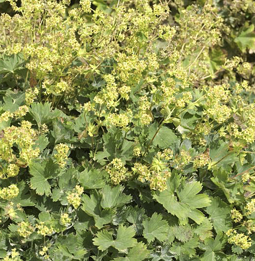Alchemilla vetteri Very compact, neat, slowly spreading ground cover. Typical lime green flowers over beautifully shaped grey-green leaves. A lovely hardy plant, rarely listed. 15cm. high. Price: £7.20