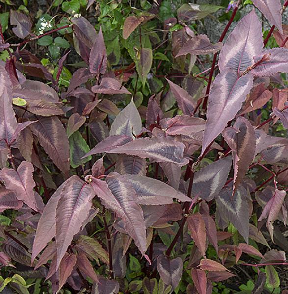 Persicaria microcephala 'Red Dragon' Handsome upright foliage plant with pointed maroon leaves marked with a silvery chevron. Spires of small white flowers in late summer. Sun or part shade, 70cm high.