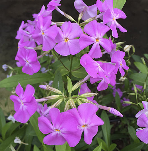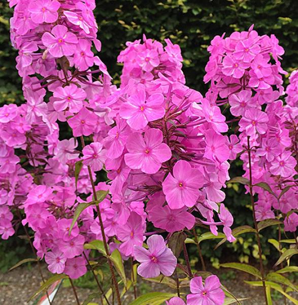 Phlox carolina 'Bill Baker' Very floriferous low bushy phlox producing a mass of white-eyed clear pink flowers all summer. Easy in any soil, sun or part shade. 45cm. high.