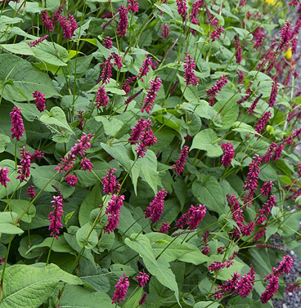 Persicaria amplexicaulis 'Fat Domino' Longer and fatter red flowers to about 1m. high over bushy mid-green foliage. August to October. Easy in any soil, sun or part shade.