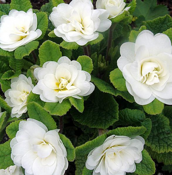 Primula vulgaris 'Dawn Ansell' One of the most lovely of all double primroses. Each pure white flower is surrounded by a collar of leaves, like a tiny posy. An easy and vigorous grower. Price: £8.00