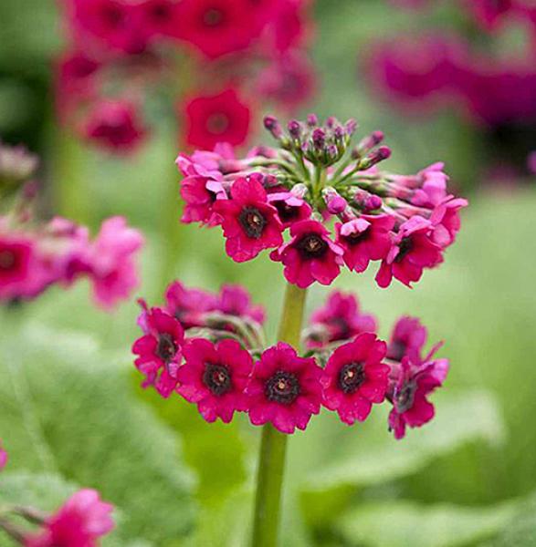 Primula japonica 'Miller's Crimson' A lovely Candelabra primrose for moist soil. Velvety crimson flowers with a dark eye, are arranged in whorls up the tall stems. 60cm. Price: £7.50