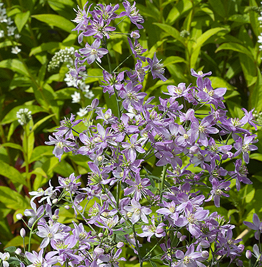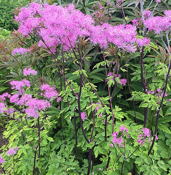 Thalictrum delavayi (Syn. T. dipterocarpum) The easiest Thalictrum to grow. From beautiful maidenhair foliage arise 120cm. high stems carrying masses of tiny lilac flowers with prominent creamy stamens. For fertile soil in part shade. Will seed around. Price: £7.50 RHS Award of Garden Merit