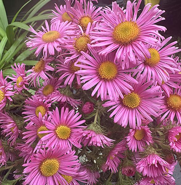 Aster novae-angliae 'Pink Beauty' A beautiful self-sown Aster from our garden, producing a mass of yellow- centered bright pink flowers on strong upright stems, late August to October. Easy in sun or part shade. 120cm. high. Price: £7.50