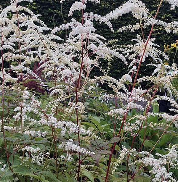 Astilbe x arendsii 'Bumalda' Clumps of bronze flushed foliage produce upright stems of feathery white flowers, becoming delicately flushed pale pink. Likes rich fertile soils in part shade. Price: £8.00