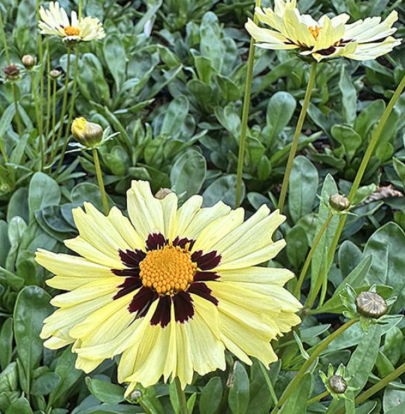Coreopsis 'Solar Moon' Good perennial with a dense compact habit. Very showy pale yellow with contrasting dark red centres from spring until autumn. Sun or part shade. 40cm. high. Price: £8.00