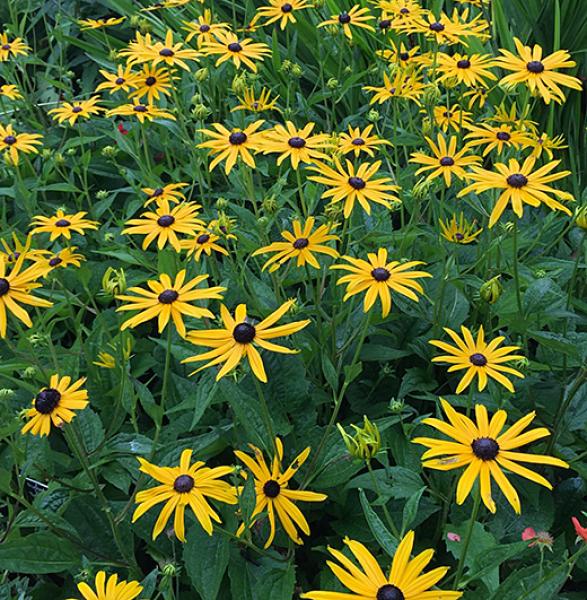 Rudbeckia fulgida 'Early Bird Gold' New, early flowering cultivar with large golden, black-centred flowers. Blooming as early as May and continuous until October. Easy in any soil, sun or part shade. 60cm. high.